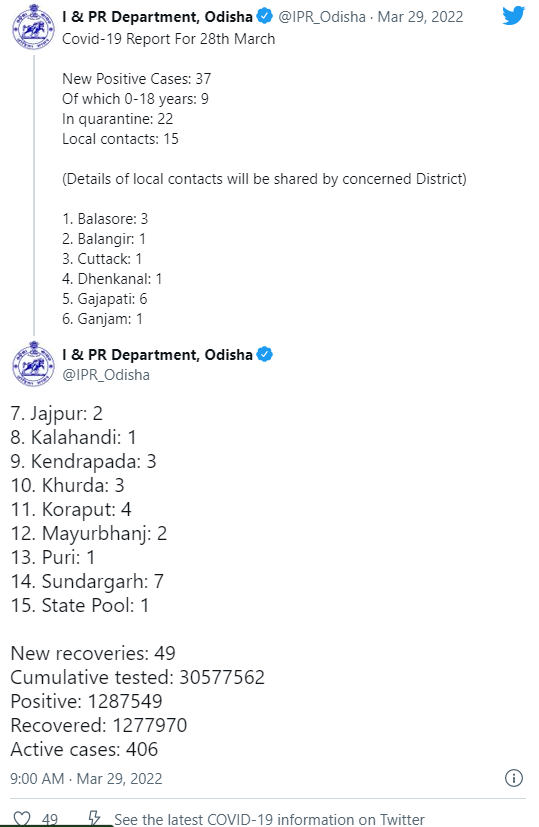 ସୂଚନା ଅନୁସାରେ , ଆଜି ୩୭ ଜଣ ପଜିଟିଭ ଚିହ୍ନଟ ହୋଇଛନ୍ତି । ସେମାନଙ୍କ ମଧ୍ୟରୁ ସଙ୍ଗରୋଧରୁ ୨୨ ଓ ସ୍ଥାନୀୟ ଅଞ୍ଚଳରୁ ୧୫ ଜଣ ଚିହ୍ନଟ ହୋଇଛନ୍ତି । ଏଥିସହ ୯ ଜଣ ୧୮ ବର୍ଷରୁ କମ୍ ବୟସର ପିଲା ସଂକ୍ରମିତ ହୋଇଛନ୍ତି । ଏହି କ୍ରମରେ ରାଜ୍ୟରେ କରୋନା ଆକ୍ରାନ୍ତଙ୍କ ସଂଖ୍ୟା ୧୨ ଲକ୍ଷ ୮୭ ହଜାର ୫୪୯ରେ ପହଞ୍ଚିଛି । ରାଜ୍ୟରେ ସୁସ୍ଥ ସଂଖ୍ୟା ୧୨ ଲକ୍ଷ ୭୭ ହଜାର ୯୭୦ ରହିଥିବା ବେଳେ ୪୦୬ ଜଣ ଚିକିତ୍ସିତ ହେଉଛନ୍ତି । ତେବେ ଆଜି ଖୋର୍ଦ୍ଧା ଜିଲ୍ଲାରୁ ସର୍ବାଧିକ ୩ ଜଣ କରୋନା ପଜିଟିଭ ଚିହ୍ନଟ ହୋଇଛନ୍ତି । ଏନେଇ ସୂଚନା ଓ ଲୋକ ସଂପର୍କ ବିଭାଗ ପକ୍ଷରୁ ସୂଚନା ଦିଆଯାଇଛି ।