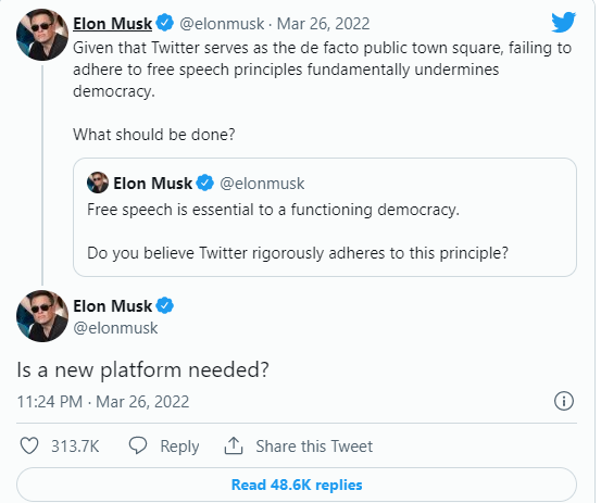 ଏଲନ୍ ମସ୍କ ଟ୍ଵିଟରରେ ପୁଣେର ଇଞ୍ଜିନିୟର ପ୍ରଣୟ ପାଥୋଲେଙ୍କର ଏକ ଟ୍ଵିଟ୍ର ଜବାବ ଦେଇ ହିଣ୍ଟ ଦେଇଛନ୍ତି ଯେ ସେ ନୂଆ ସୋସିଆଲ ମିଡିଆ ପ୍ଲାଟଫର୍ମ ତିଆରି କରିବାକୁ ଭାବୁଛନ୍ତି। ଏଥିସହ ସେ କହିଛନ୍ତି, ସୋସିଆଲ ମିଡିଆରେ ବିନା ପ୍ରଚାରରେ କଥା କହିବାକୁ ସ୍ୱାଧୀନତା ମିଳିବ। ଏଲନ୍ ମସ୍କଙ୍କର ଏହି ଟ୍ଵିଟ୍କୁ ନେଇ ଲୋକମାନେ ବି ବିଭିନ୍ନ ପ୍ରତିକ୍ରିୟା ଦେଉଥିବା ଦେଖାଯାଇଛି।