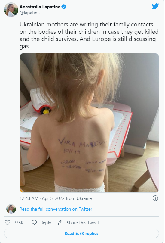 ଆନାସ୍ତାସିଆ ଲାପାଟିନା ପେଶାରେ ସାମ୍ବାଦିକା । ସେ ନିଜର ଏକ ଫଟୋ ସେୟାର କରିଛନ୍ତି। ଯେଉଁଥିରେ ଜଣେ କୁନି ଝିଅ ପିଠିରେ ନିଜ ଘରର ଠିକଣା ଲେଖାଯାଇଛି। ଏହି ଫଟୋର କ୍ୟାପସନରେ ଲେଖାଯାଇଛି କି, ୟୁକ୍ରେନର ମା’ମାନେ ନିଜ ପିଲାଙ୍କ ପିଠିରେ ଠିକଣା ଲେଖିଛନ୍ତି। ଯଦି ସେମାନଙ୍କର କିଛି ହୁଏ, ତେବେ ସେମାନଙ୍କ ପିଲା ସୁରକ୍ଷିତ ରହିଯିବ। ଫଟୋ ସେୟାର ହୋଇଥିବା ପିଲା ହେଉଛି @ aleksandra.mako। ଏହି ଫଟୋ ଦେଖିବା ଅତି ହୃଦୟ ବିଦାରକ। ଏହି ଫଟୋ ଦେଖି କାହା ହୃଦୟ ମଧ୍ୟ ଭାଙ୍ଗିପଡିବ। ଏହାସହିତ ୟୁଜର୍ସ ଏହି ଫଟୋ ଦେଖି ପିଲାଙ୍କ ପାଇଁ ପ୍ରାର୍ଥନା କରୁଛନ୍ତି। ଏମିତି କେତେକ ଭିଡିଓ ଏବଂ ଫଟୋ ସାମ୍ନାକୁ ଆସିଛି ଯାହା ଆପଣଙ୍କୁ ନିଶ୍ଚିତ ବିଚଳିତ କରିବ।