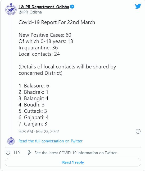 ଡୁମାଣୀ ଟିଭି ,୨୩/୩ : ଗତ ୨୪ ଘଣ୍ଟା ମଧ୍ୟରେ ରାଜ୍ୟରେ ୬୦ କରୋନା ପଜିଟିଭ୍ ଚିହ୍ନଟ ହୋଇଛନ୍ତି । ଏହାକୁ ମିଶାଇ ରାଜ୍ୟରେ ମୋଟ ଆକ୍ରାନ୍ତଙ୍କ ସଂଖ୍ୟା ୧୨୮୭୨୮୫ ଜଣକୁ ବୃଦ୍ଧି ପାଇଛି । ଏନେଇ ରାଜ୍ୟ ସୂଚନା ଓ ଲୋକ ସମ୍ପର୍କ ବିଭାଗ ପକ୍ଷରୁ ଟ୍ଵିଟ୍ ଯୋଗେ ସୂଚନା ଦିଆଯାଇଛି । ତେବେ ଚିହ୍ନଟ ହୋଇଥିବା ସଂକ୍ରମିତଙ୍କ ମଧ୍ୟରୁ ୩୬ ଜଣ କ୍ୱାରେଣ୍ଟାଇନ୍ରୁ ରହିଥିବା ବେଳେ ୨୪ ଜଣ ସ୍ଥାନୀୟ ସଂକ୍ରମିତ ରହିଛନ୍ତି । ସେହିପରି ଚିହ୍ନଟ ହୋଇଥିବା ଆକ୍ରାନ୍ତଙ୍କ ମଧ୍ୟରେ ୧୮ ବର୍ଷରୁ କମ୍ ବୟସର ୧୩ ଜଣ ରହିଛନ୍ତି ।ଚିହ୍ନଟ ହୋଇଥିବା ସଂକ୍ରମିତଙ୍କ ମଧ୍ୟରୁ ବାଲେଶ୍ୱର ୬ଜଣ, ଭଦ୍ରକ ଜିଲ୍ଲାରୁ ଜଣେ, ବଲାଙ୍ଗୀର ଜିଲ୍ଲାରୁ ୪ଜଣ, ବୌଦ୍ଧ ଜିଲ୍ଲାରୁ ୪ଜଣ, କଟକ ଜିଲ୍ଲାରୁ ୩ଜଣ, ଗଜପତି ଜିଲ୍ଲାରୁ ୪ଜଣ, ଗଞ୍ଜାମ ଜିଲ୍ଲାରୁ ୩ଜଣ, ଯାଜପୁର ଜିଲ୍ଲାରୁ ୫ଜଣ, କେନ୍ଦ୍ରାପଡ଼ା ଜିଲ୍ଲାରୁ ୩ଜଣ, ଖୋର୍ଦ୍ଧା ଜିଲ୍ଲାରୁ ୬ଜଣ, କୋରାପୁଟ ଜିଲ୍ଲାରୁ ୪ଜଣ, ମୟୁରଭଞ୍ଜ ଜିଲ୍ଲାରୁ ୩ଜଣ, ନୟାଗଡ଼ ଜିଲ୍ଲାରୁ ଜଣେ, ରାୟଗଡ଼ା ଜିଲ୍ଲାରୁ ଜଣେ, ସମ୍ବଲପୁର ଜିଲ୍ଲାରୁ ୨ଜଣ, ସୁନ୍ଦରଗଡ଼ ଜିଲ୍ଲାରୁ ୯ଜଣ, ଷ୍ଟେଟ ପୁଲ୍ରୁ ୨ଜଣ ରହିଛନ୍ତି ।