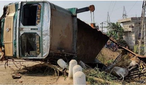 ବାଲେଶ୍ୱର:  ବାଲେଶ୍ୱର ଜିଲ୍ଲା ବସ୍ତା ଥାନା ଅନ୍ତର୍ଗତ ୬୦ ନଂ ଜାତୀୟ ରାଜପଥର ଗାନ୍ଧି ଛକ ନିଟକରେ ଆଜି ସକାଳେ ଘଟିଯାଇଛି ଏକ ମର୍ମନ୍ତୁଦ ସଡ଼କ ଦୁର୍ଘଟଣା । ଫଳରେ ତିନି ଜଣ ଶ୍ରମିକଙ୍କ ଶୋଚନୀୟ ମୃତ୍ୟୁ ଘଟିଥିବା ବେଳେ ୩୦ ଗୋରୁ ପ୍ରାଣ ହରାଇଛନ୍ତି ।